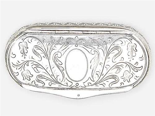 Silver, 58 g, gilt interior. Oval form with engraved decoration and hinged cover. Marked: Prague, late 19th century, R. L. maker’s mark. Size: 8 x 4 x 2 cm