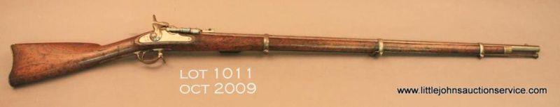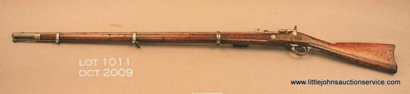 Snyder conversion musket with E. Robinson New York lock plate, .58 cal., 38” round barrel, wood stock, #NVSN. This gun is in overall good condition with a light patina over metal surfaces; the Snyder opening breech block conversion hasbeen made to an E. Robinson musket with lock plate dated 1863. The bore is near fine, the markings sharp, the action crisp and both sling swivels remain with the musket. The wood is overall good with scattered wear, nicks and mars from carry and storage and an old repaired crack can be seen on the right side of the fore stock just in front of the lock plate; steel ramrod retained. Est.: $300-$600.