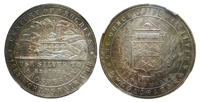 Century of Progress, Colorado Dollar, 1933, HK-870. NGC MS67 with stunning blue, sea-green and violet toning. An exceptional example with great eye appeal!