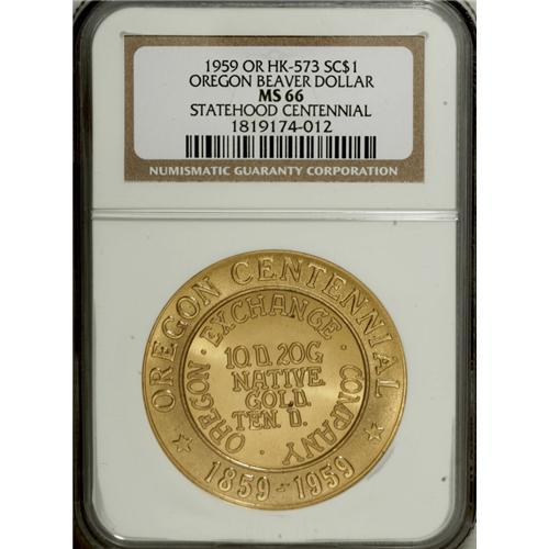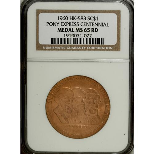 <B>So-Called Dollar Two-Piece Group.</B></I> Consists of a <B>1959 Oregon Beaver Dollar MS66 NGC,</B></I> HK-573, Oregon Exchange Company replica designs with commemorative inscriptions outside, struck in gilt bronze; and a <B>1960 Pony Express Centennial Official Medal MS65 Red NGC,</B></I> HK-583, obverse with three founders' busts, reverse with rider on horse, struck in bronze with lovely reddish-orange color.<BR><BR><b>Shipping:</b> Coin/Currency (<a target="_blank" href="http://www.heritageauctions.com/common/shipping.php">view shipping information</a>)