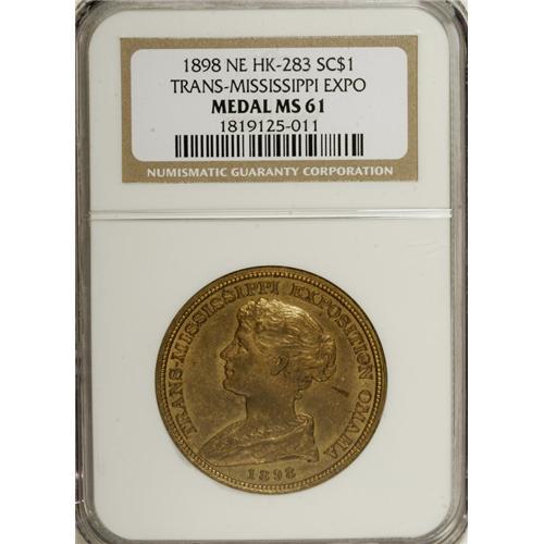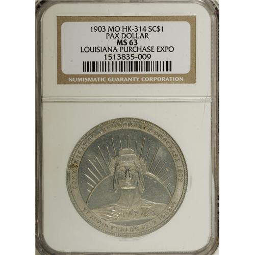 <B>So-Called Dollar Two-Piece Lot.</B></I> Includes: <B>1898 Trans-Mississippi Exposition Dollar MS61 NGC,</B></I> HK-283, obverse with female bust facing left, reverse with Indian-and-bison genre hunting scene, struck in brass; and an <B>1903 Pax Dollar, Louisiana Purchase Exposition MS63 NGC,</B></I> HK-314, obverse with female bust representing Peace, reverse with a ship and Columbus commemorative inscription, struck in aluminum.<BR><BR><b>Shipping:</b> Coin/Currency (<a target="_blank" href="http://www.heritageauctions.com/common/shipping.php">view shipping information</a>)