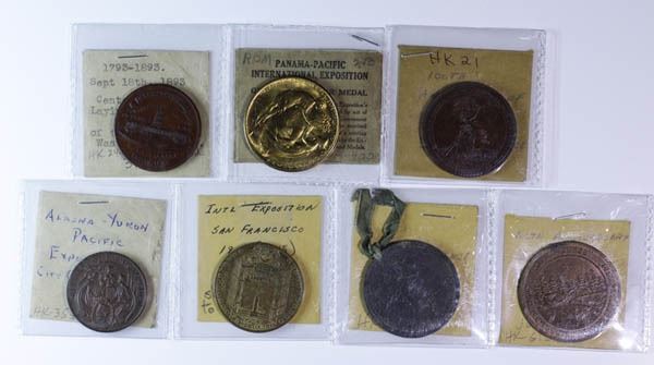 So-Called Dollars, 7 pieces. Includes HK #244 in bronze unlisted and HK #400 with original envelope. Both, uncirculated0.