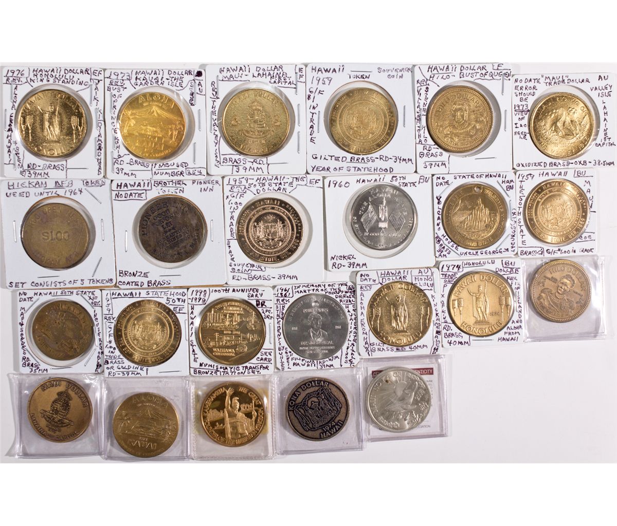 Lot of 24 So-Called Dollars, including modern examples, commemorating various Hawaiian locations and icons, including Maui, Kona, Wahiawa, Kamahameha, James Cook, and many more. -60828