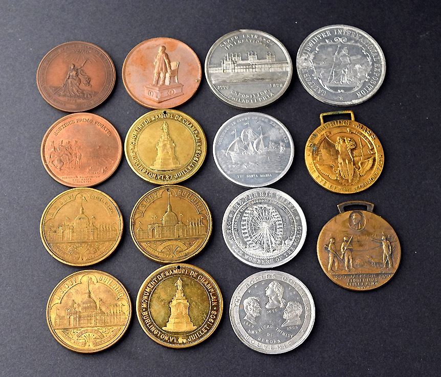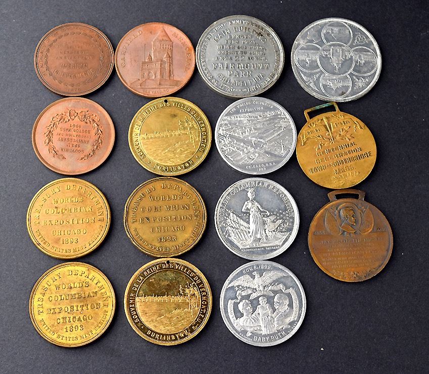 (1)- 1876, Genius of American Independence, Ae, 38mm, HK-21, EF; Exposition Building, Wm, 43mm, HK-80, VF, bent; World's Columbian Exposition, U.S. Gov't Building, Large lettering, brass, 37mm, HK-154, Eglit 23, (2), Fine, numerous edge bumps; EF; as last, but small lettering, HK-155, Eglit-23a, EF; The Santa Maria, Al, 38mm, HK-167, EF, light corrosion; Ferris Wheel/Woman Standing, Al, 38mm, HK-173, Eglit-537, EF; Baby Ruth / Trio of Heroes, Al, 38mm, HK-241, Eglit-80, King-508, VF; California Midwinter Exposition, 1894, Al, 45mm, HK-256, VF, corrosion; Evacuation of Boston, 125th Anniversary, Ae, 38mm, HK-131, Baker-52R, EF; Unlisted, Garfield Memorial, Ae, 38mm, VF; 250th Anniversary of Champlain, Burlington, Vermont, 1903, Brass, 38mm, VF, (2); Fob, Centennial of Southbridge, Mass., 1916; Jackson Centennial, 1929; total of 15 pcs.