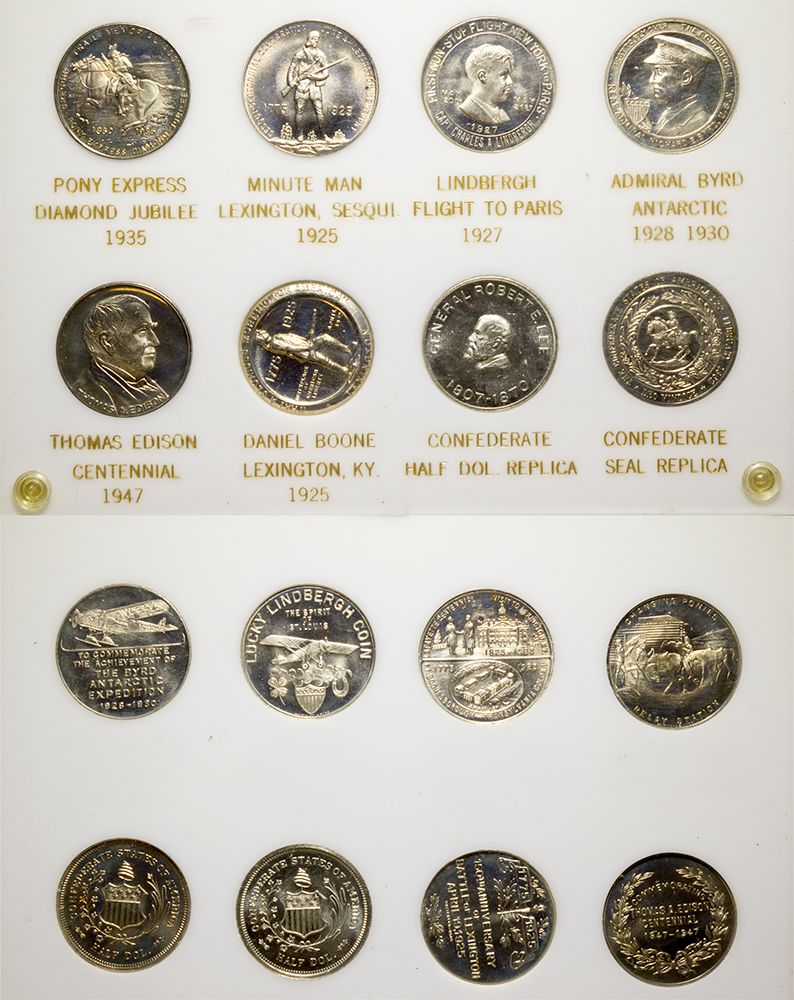 8 so-called half-dollars in a Capital Plastic holder. All in gem uncirculated condition except the Robert E. Lee replica. Others include Pony Express Diamond Jubilee (1935), Minute Man Sesquitennial (1925), Lindbergh Flight to Paris (1927), Admiral Byrd (1928), Thomas Edison Centennial (1947), Daniel Boone (1925), and a confederate seal replica. - HKA#62324