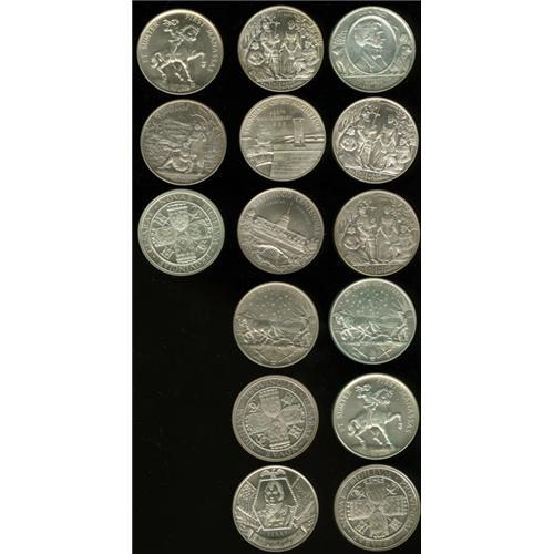 <B>So-Called Silver Half Dollar Group Lot, MS60 Uncertified.</B></I> Group lot struck by the Heraldic Art Medal Company. The average mintage for these was in the range of 5,000 to 7,000 specimens. Themes include events in U.S. history from the Alaska Purchase to the end of the Civil War. The lot has 10 different medals and six duplicates. A nice starter set, with a market value ranging from $125 to $200.<BR><BR><b>Shipping:</b> Coins & Currency (<a target="_blank" href="http://www.heritageauctions.com/common/shipping.php">view shipping information</a>)