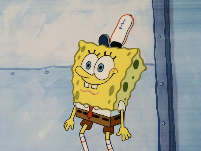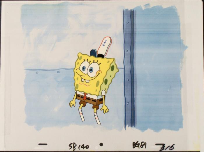 This animation cel and reproduction background are from the Nickelodeon TV show SpongeBob Squarepants. The story takes place under the deep blue sea in Bikini Bottom, where SpongeBob resides. SpongeBob, who is a yellow, porous sponge, is your typical happy-go-lucky character, as he is always cheerful and enjoys making people laugh. Patrick Star, SpongeBob's neighbor who is a starfish, is your average children's show idiot, as he boasts knowing nothing and is often getting himself into ridiculous situations. Between the homes of these two lies the home of the miserable Squidward, a squid, who is known for being grouchy and playing tricks on SpongeBob and Patrick. Both SpongeBob and Squidward work at the Krusty Krab, a fast food business run by the greedy money-loving Mr. Krabs, a crab, the arch rival of the evil, possibly misunderstood, Plankton. Another neighbor, Sandy Cheeks, an athletic squirrel who normally wears an astronaut's space suit, was introduced in "Tea at the Treedome." She spends most of her time inventing and experimenting. Why is SpongeBob so happy?Original Printed Background and Animated Cel Overall Size of Background: 11" x 17" Overall Size of the Cel: 10 1/2" x 12 1/2" Very good condition This is an original hand-painted cel set-up used in the production of an episode of "SpongeBob SquarePants." Each one-of-a-kind set-up represents a slight change in position of the characters. When individually photographed and projected in rapid succession, the images appear to move.