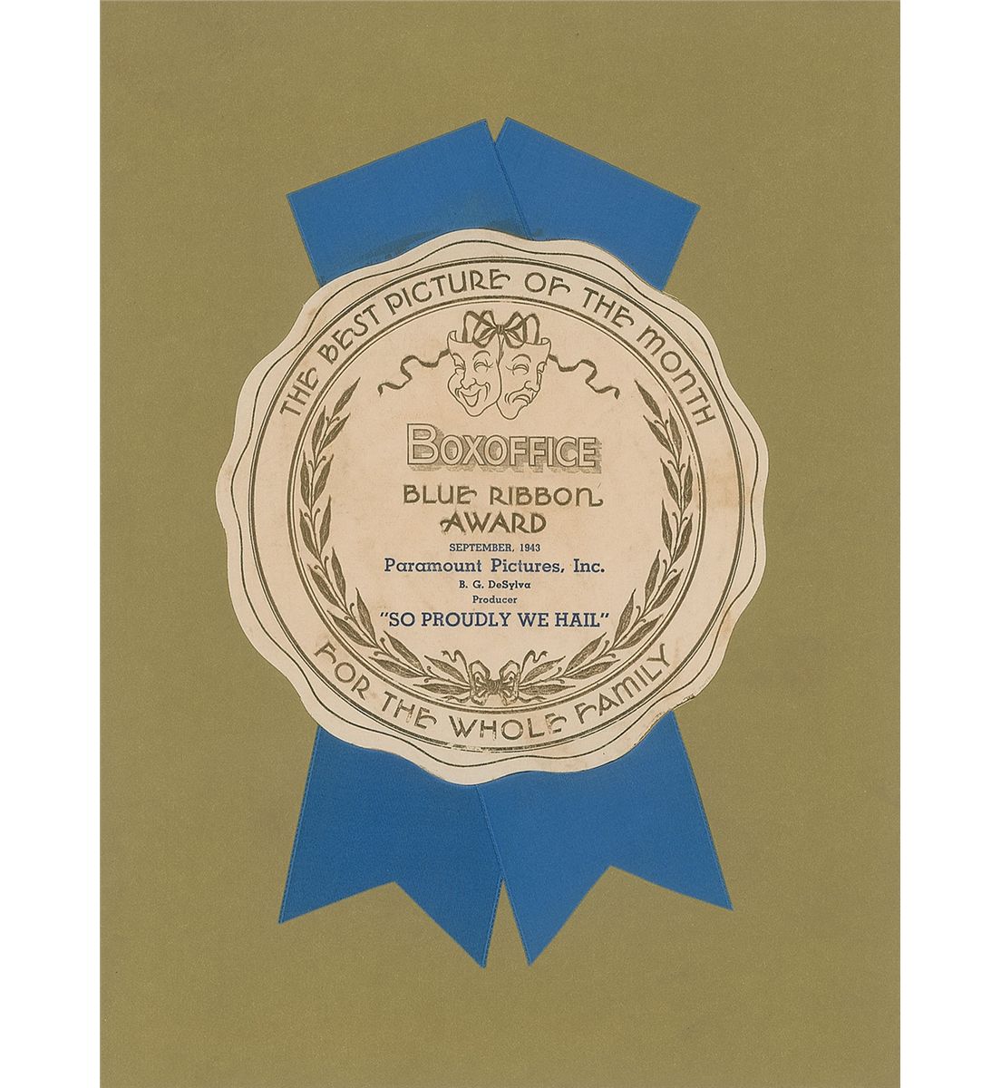 Original Box Office Blue Ribbon award, dated September 1943, paper with gold lettering and two blue ribbons mounted on an 8.5 x 11.5 gold board, presented to Paramount Pictures, Inc., “B. G. DeSylva Producer ‘So Proudly We Hail.’” Some scattered light soiling to board, otherwise fine condition.