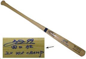 So Taguchi is a Japanese former outfielder. He played eight years in Major League Baseball with the St. Louis Cardinals, Philadelphia Phillies and Chicago Cubs, followed by a final two years in Japan with the Orix Buffaloes.Taguchi is the first Japanese National League player to win a World Series. Taguchi is also the first Japanese player to win two World Series with different teams, with the St. Louis Cardinals in 2006 and the Philadelphia Phillies in 2008. So Taguchi has hand signed this Rawlings Big Stick Blonde Name Engraved Bat (in English and Japanese) with 2X WS Champ inscription. MAB Hologram and Certificate of Authenticity from Athlon Sports.