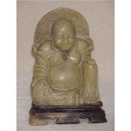 A soapstone figure of a seated buddha, 7" tall, 4 3/4" wide. A jolly smiling buddha atop a carved soapstone stand. Condition is very good. (12)