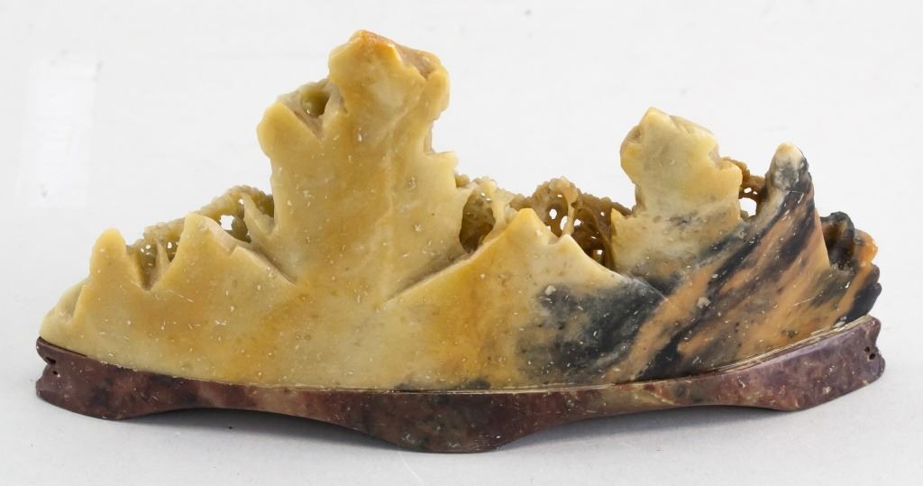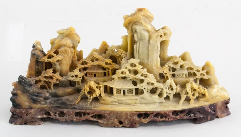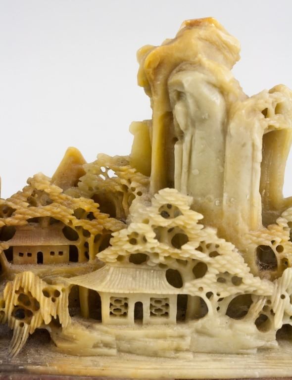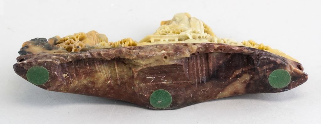 Chinese soapstone carving. Featuring landscape with houses, mountains, and trees. Delicately carved. 11 x 20 cm. 695 grams.