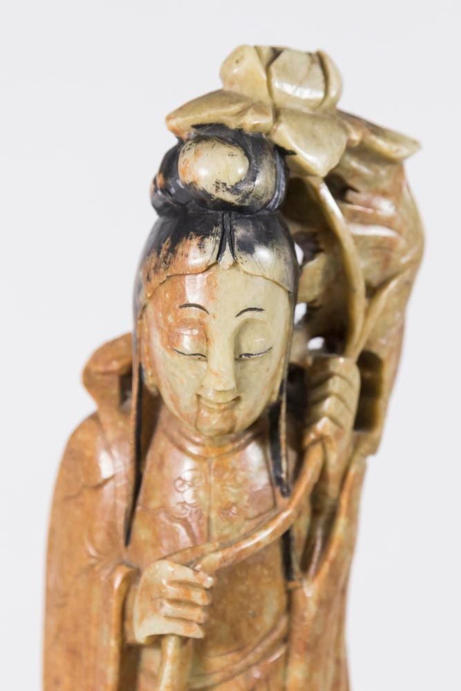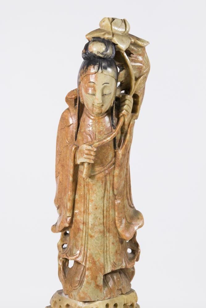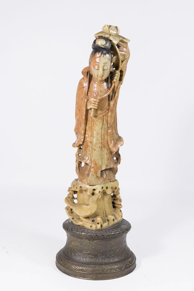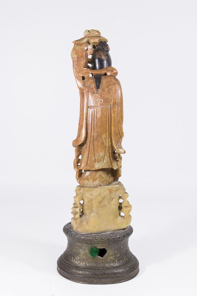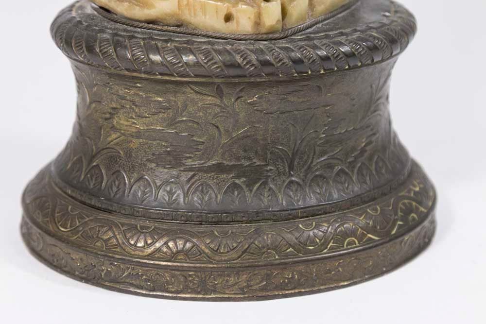 Mounted on metal base. Approx. 17 3/4" H with base. From a Florida gentleman's estate collection. Used to be a lamp. 2 holes on back.