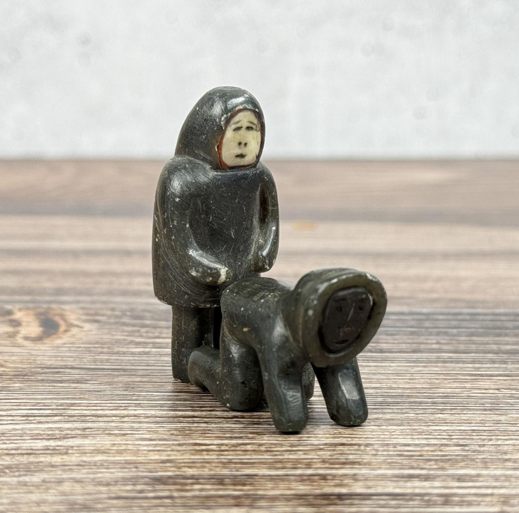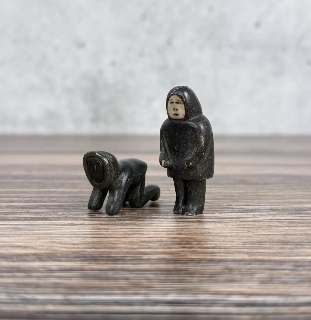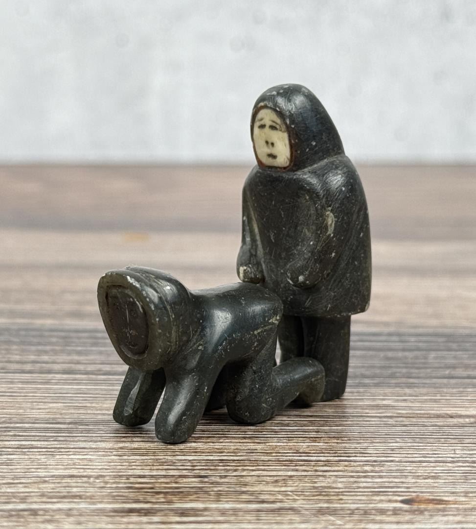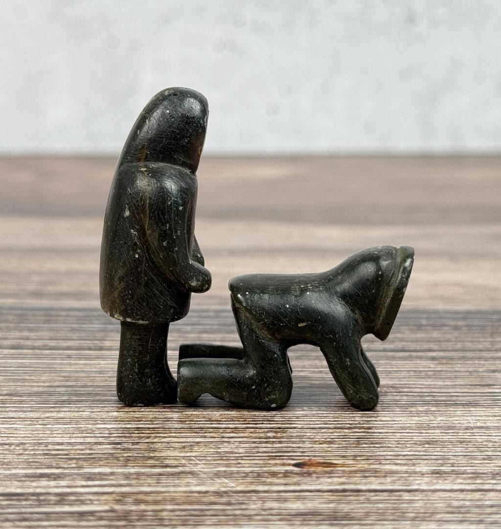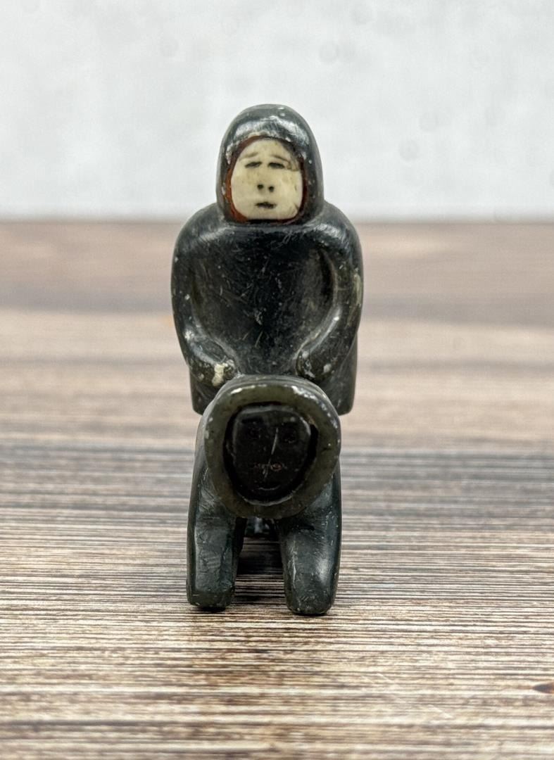 Male figure is 2" tall. Just big enough to get the job done. Carved Soapstone with Walrus Ivory Face. Native made prior to 1972. This item cannot be shipped to Oregon, California, Hawaii, New York, New Jersey, Internationally, or any other state that prohibits. Provenance: Heard Museum, Arizona; Private Collection, New York.