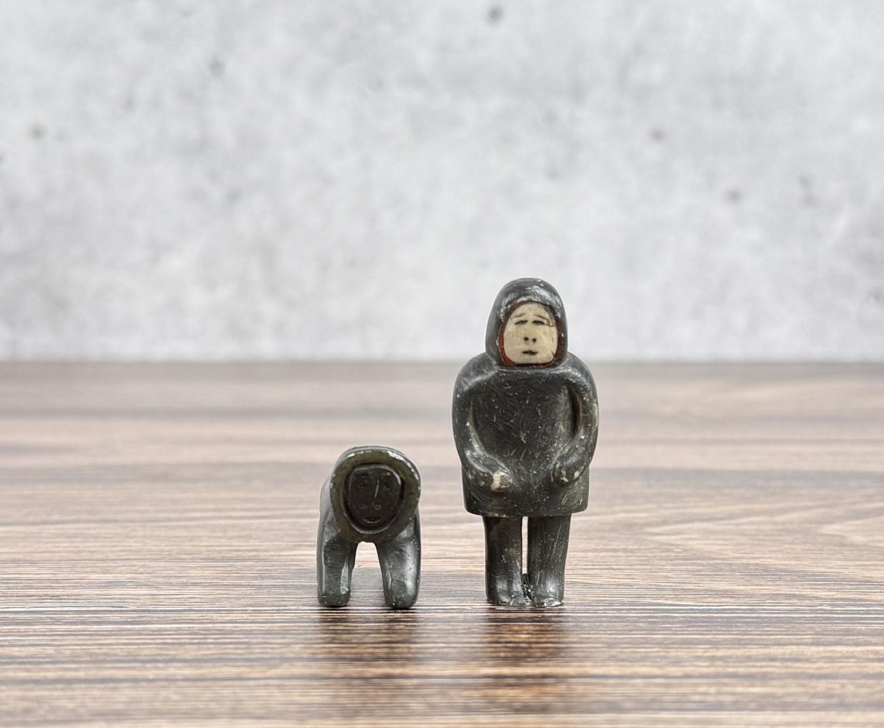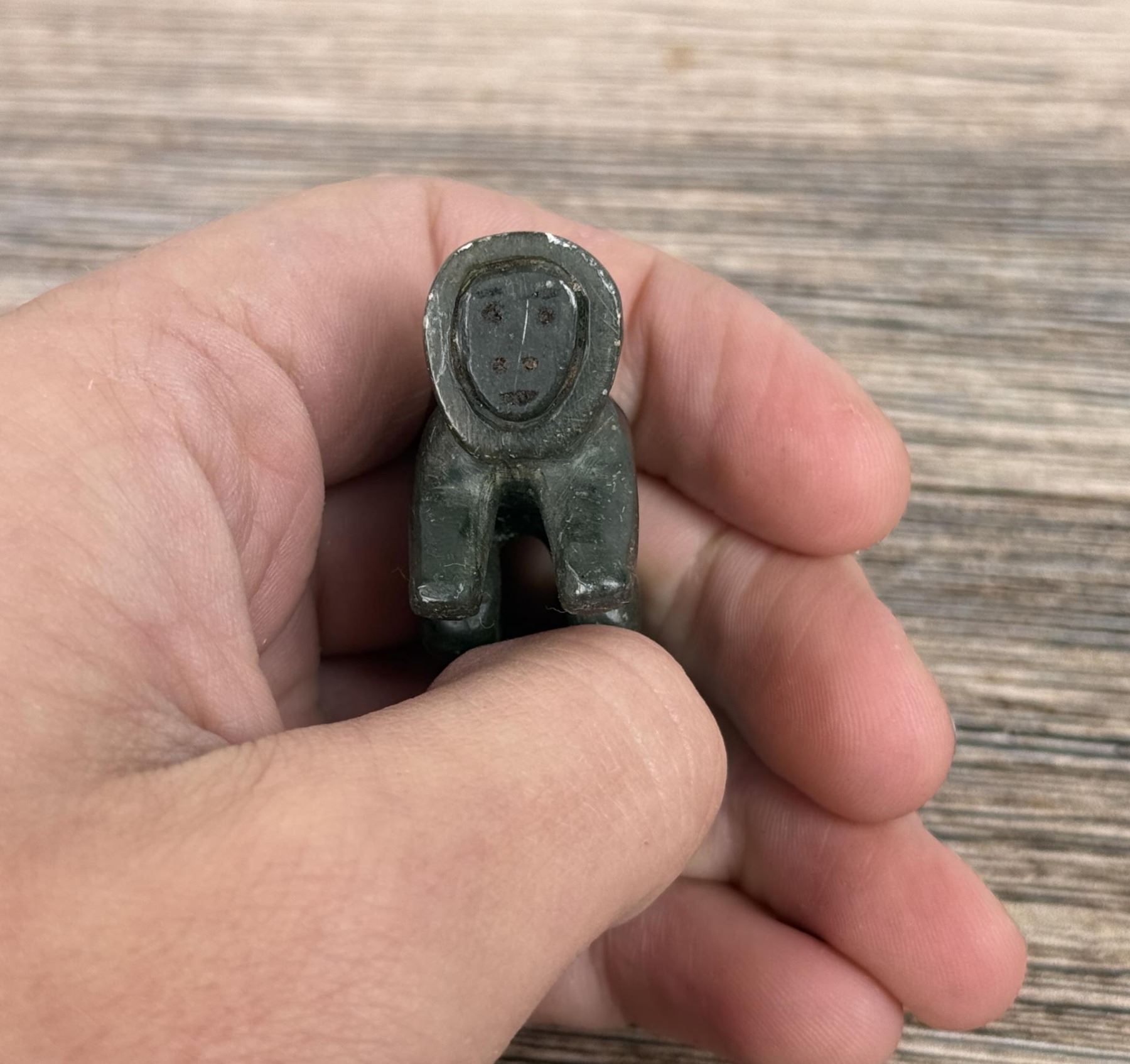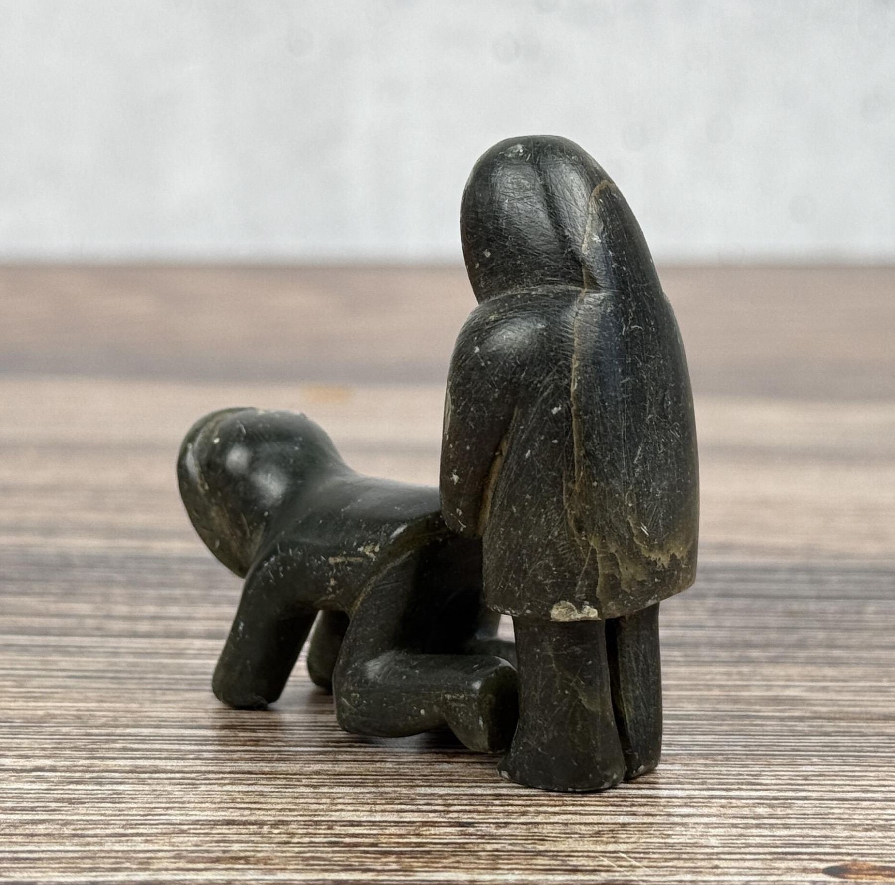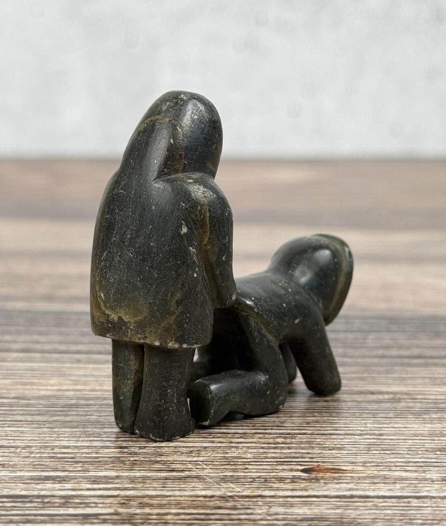 Male figure is 2" tall. Just big enough to get the job done. Carved Soapstone with Walrus Ivory Face. Native made prior to 1972. This item cannot be shipped to Oregon, California, Hawaii, New York, New Jersey, Internationally, or any other state that prohibits. Provenance: Heard Museum, Arizona; Private Collection, New York.