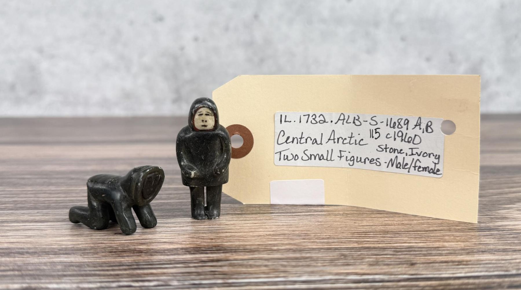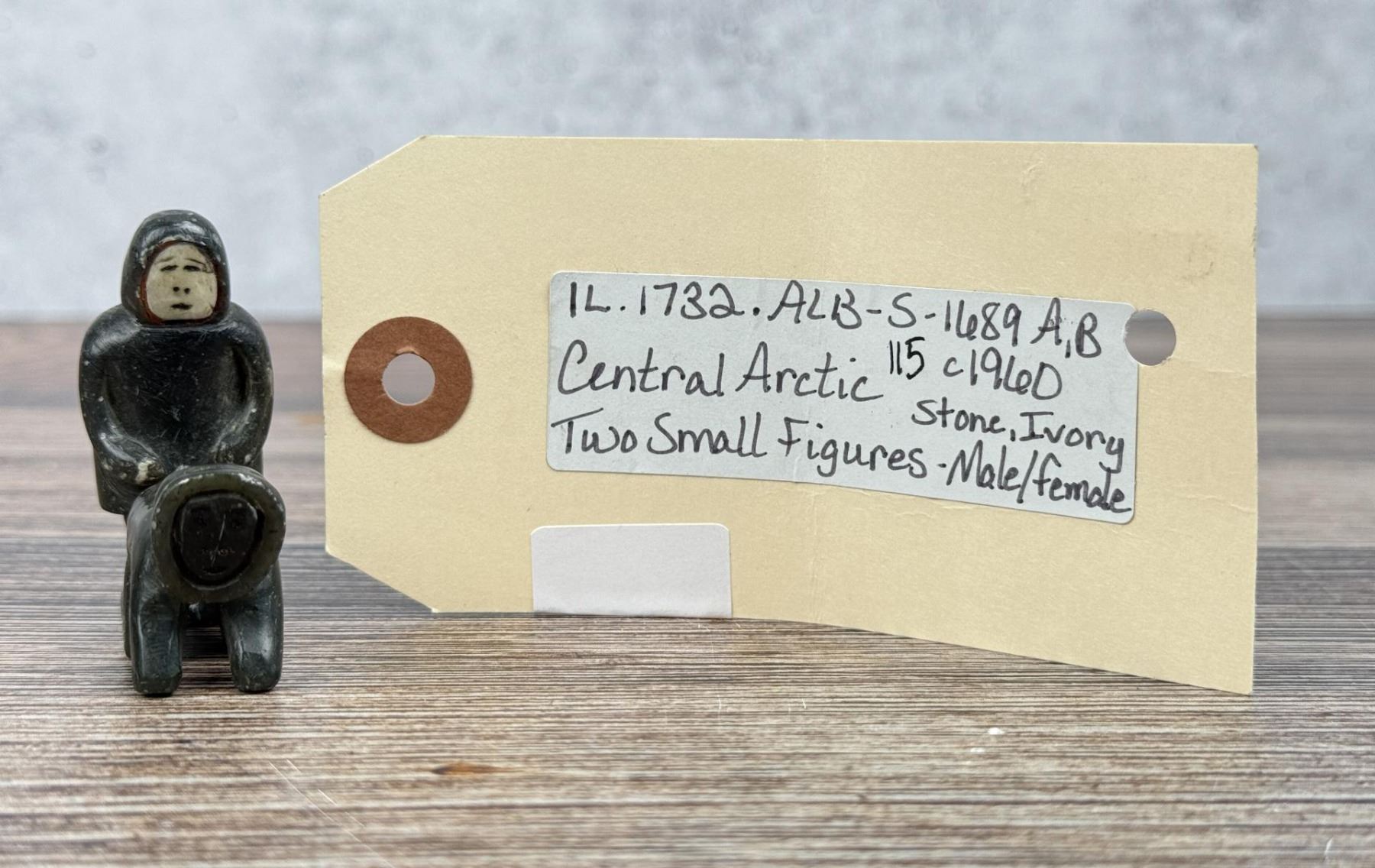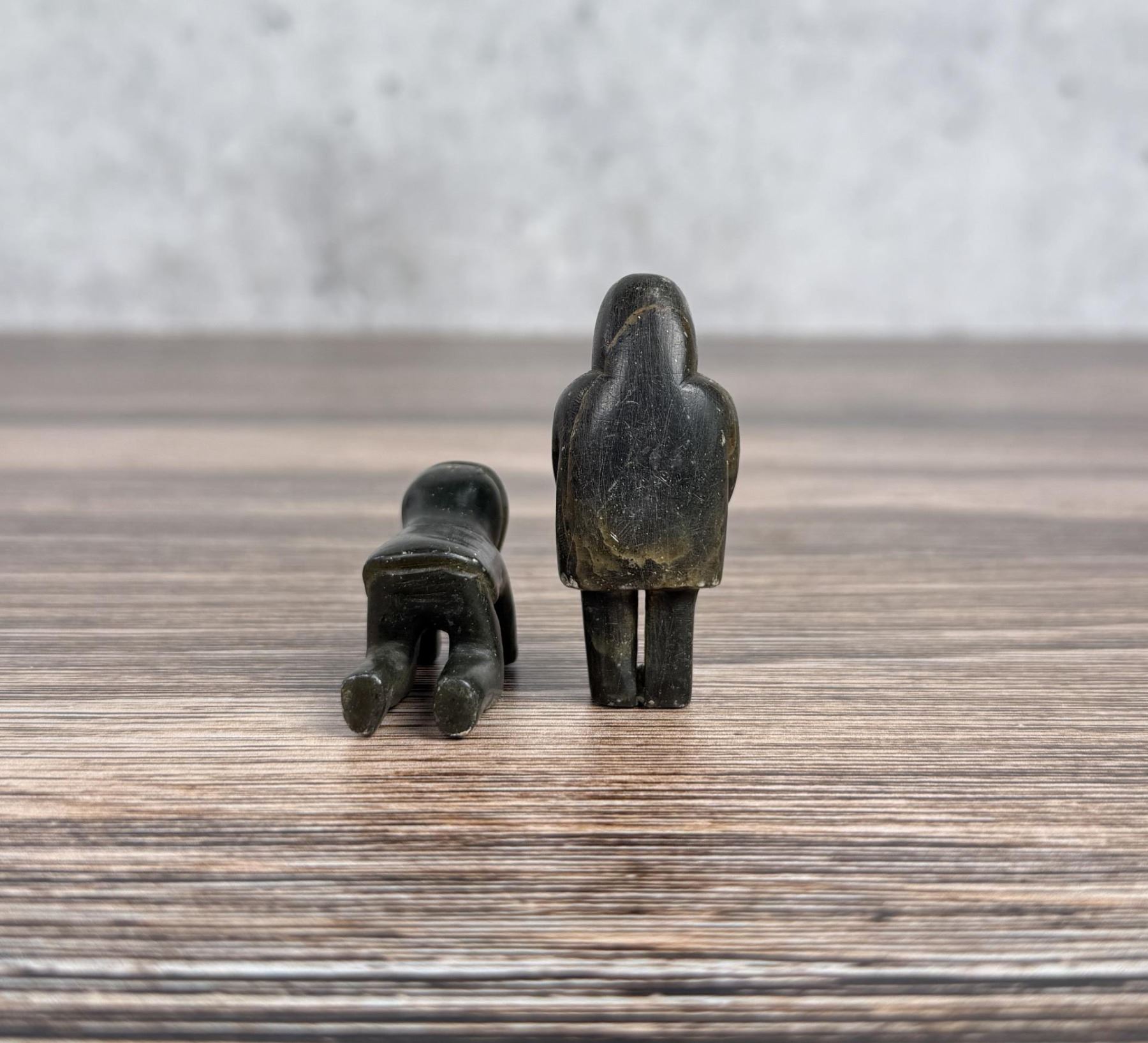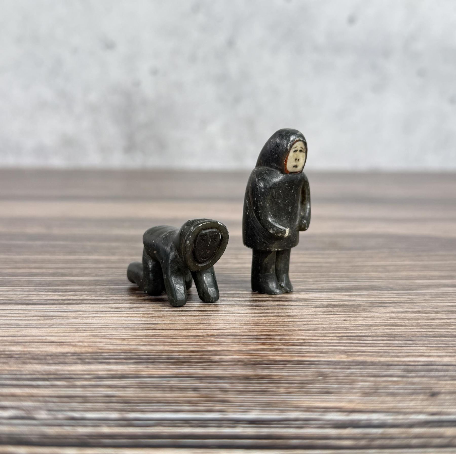Male figure is 2" tall. Just big enough to get the job done. Carved Soapstone with Walrus Ivory Face. Native made prior to 1972. This item cannot be shipped to Oregon, California, Hawaii, New York, New Jersey, Internationally, or any other state that prohibits. Provenance: Heard Museum, Arizona; Private Collection, New York.