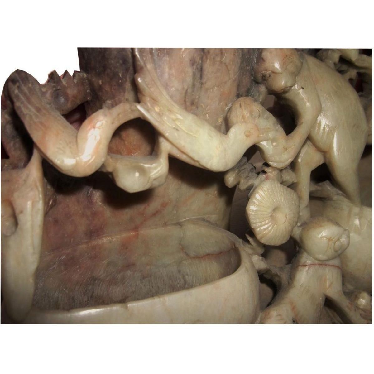 Large, oriental, dual brush pots brush wash bixi sculpture. Intricately hand-carved soapstone depicts monkeys, birds & bats. 9 3/4" length X 2 1/4" deep X 6 3/4" high.