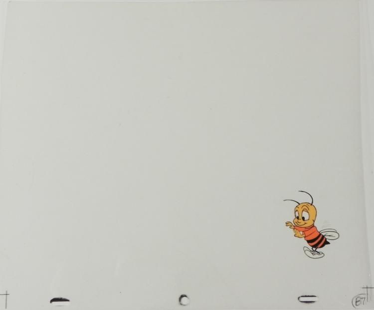 Buzz is soaring threw the air Original Animation CelMedium: Hand painted acetate celDetails: Animation notations and peg holes Size of cel: 10 1/2 x 12 1/2 inchesCondition: Very good This is an original hand-painted cel set-up used in the production of the "Cheerios commercial." Each one-of-a-kind set-up represents a slight change in position of the characters. When individually photographed and projected in rapid succession, the images appear to move. To created production cels, the original animator's drawing is transferred onto an acetate cel (by hand-inking and/or photo copying). The cel is then hand-painted on the reverse side. The cel has multiple layers. Three different positions of Buzz