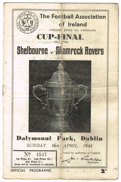 A collection of assorted League of Ireland programmes including FAI Cup Finals for 1944 Shelbourne v Shamrock Rovers, 1972 and 1973. Also Shelbourne programmes for 17/02/40 v Brideville, 09/11/40 v St James's Gate, 15/02/41 v Bohemians. Leinster Football Association Challenge Cup Semii-Final Bohemians v Brideville 07/12/1940. Shelbourne 1984-5 season programmes (8), St Patrick's Atlethic 1984-5 (4), etc. (23 items)