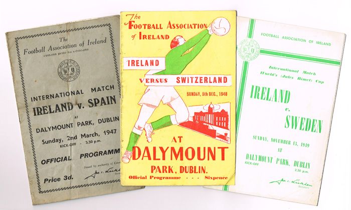 A collection of early Irish home programmes. Comprising of v Spain 02/03/47, v Portugal 04/05/47, v Switzerland 05/12/48, v Belgium 24/04/49, v Portugal 22/05/49 (2), v Spain 12/06/49, v Finland 08/09/49, v Sweden 13/11/49 and an unofficial programme v Switzerland 05/12/48. (10 items)