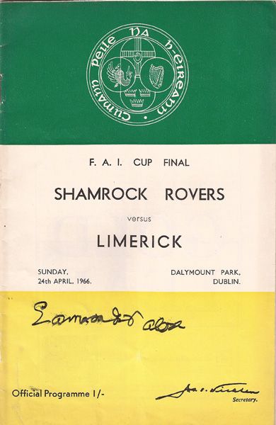 Match programme for the F.A.I. cup final held on the day of the 50th Anniversary of the 1916 Rising. Signed on the front cover by Éamon de Valera. An interesting dated signature.