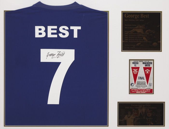 An attractively framed collectors item with replica blue Manchester United 1968 European Cup Final shirt signed by George Best on his number 7. Accompanied by facsimilae final programme and plaques commemorating both Best and the match.