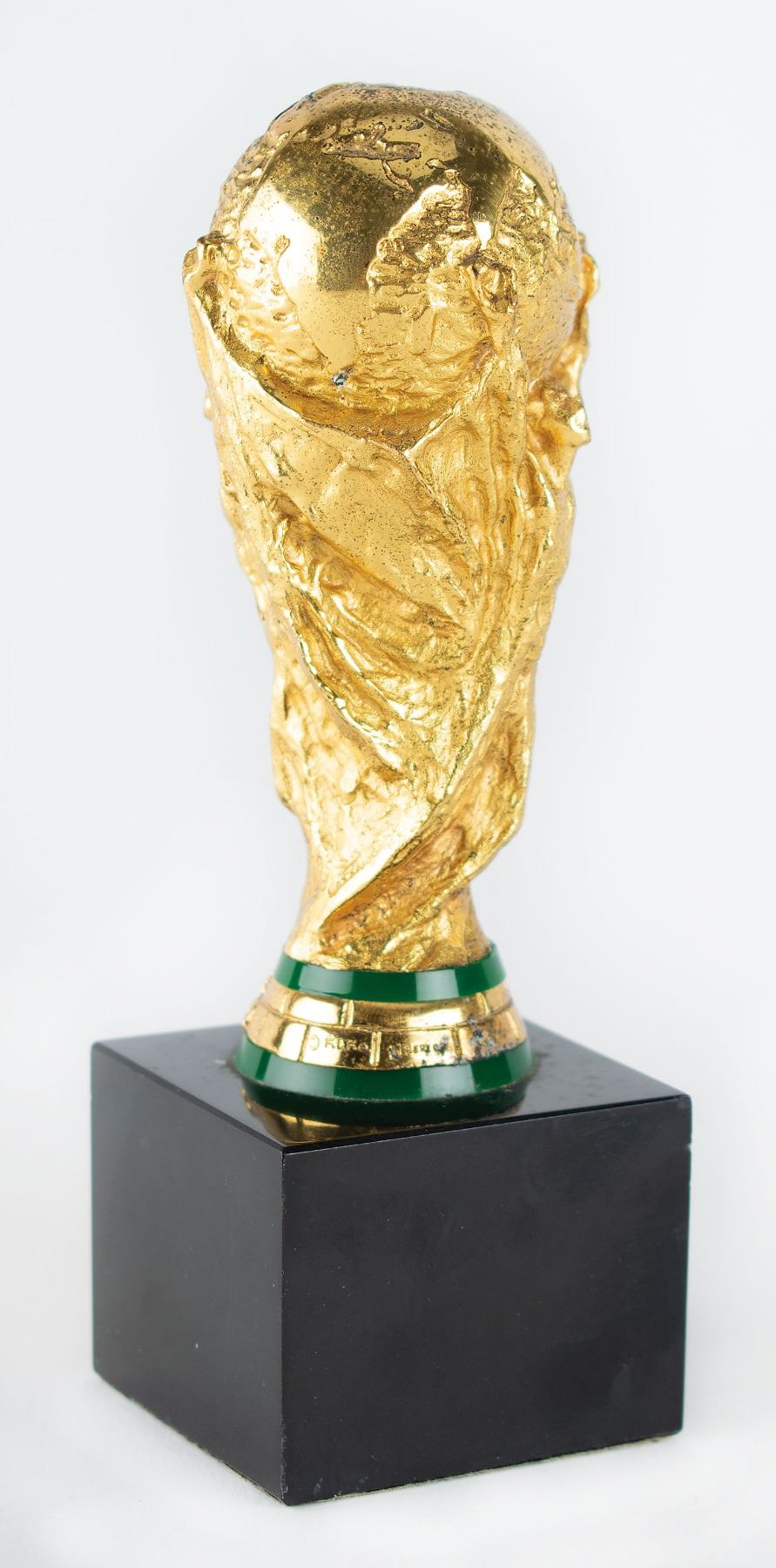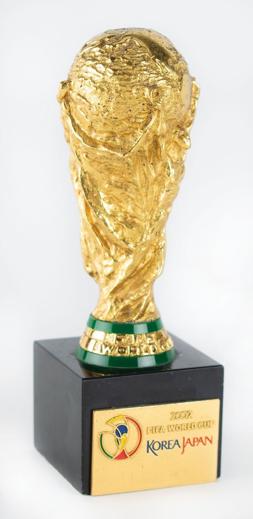 Uncommon 2002 FIFA World Cup participation trophy, which accurately replicates the official FIFA World Cup trophy. This miniaturized version measures 4.25˝ in height, and is set on a deep brown 2˝ x 1.5˝ x 2˝ base, with front plate featuring tourney logo and text, “2002 FIFA World Cup, Korea Japan.” Made by Bertoni of Milan. In fine condition. Accompanied by a certificate of authenticity from Alexandre Silva da Silveira, a coordinator for the Brazil National Soccer Team, who affirms that the trophy derives from his personal collection. South Korea and Japan were selected as hosts for the first World Cup to be hosted by two countries. Brazil won the tournament for a record fifth time by beating Germany 2-0 in the final.