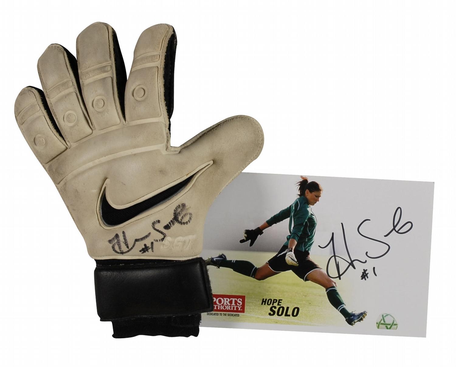 Game-used Nike left-handed goalie glove, signed on the wrist in black felt tip; and a color 8.5 x 5.5 cardstock promotional photo of Solo wearing a similar style glove, signed in black felt tip. In fine condition, with expected wear and soiling to glove.