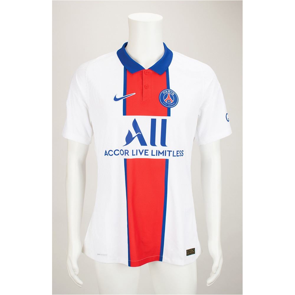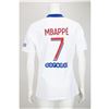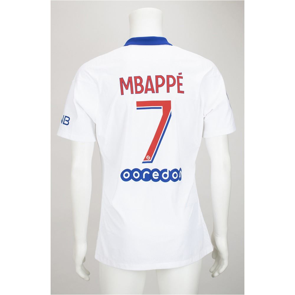 Official Paris Saint-Germain F.C. away jersey worn by forward Kylian Mbappe during a Ligue 1 match in the 2020-2021 season. The Nike Vaporknit jersey, size large, features sponsors, PSG, and Ligue 1 patches to the chest and shoulders, and surname and number “7†to the back. In fine condition, with expected wear from use. Accompanied by a certificate of authenticity from Alexandre Silva da Silveira, a coordinator for the Brazilian National Soccer Team, who affirms that the jersey derives from his personal collection.