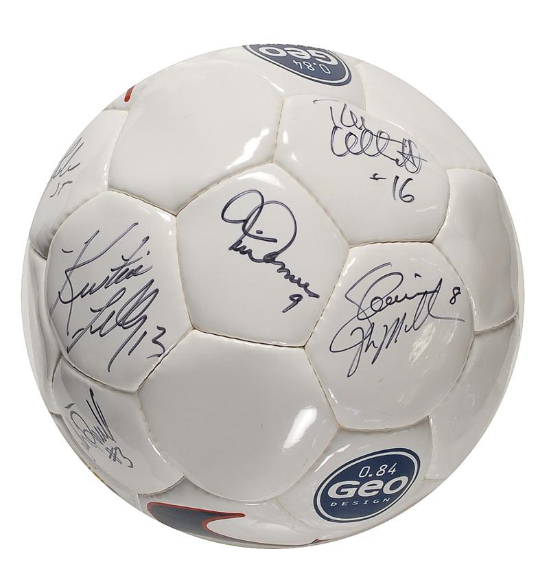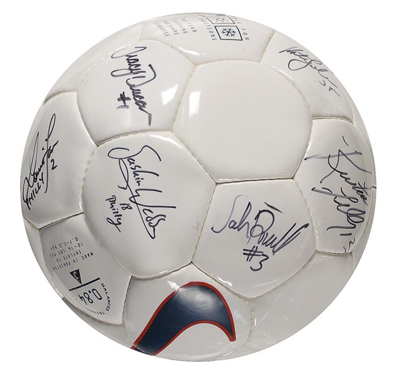 Nike white leather soccer ball, signed in black felt tip by nine members of the circa 2001 US Women’s Soccer Team including Mia Hamm, Kristine Lilly, and Tracy Ducar. In fine condition, with ball underinflated.