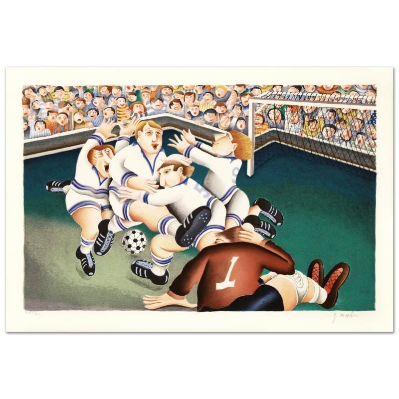 "Soccer" is a limited edition lithograph on paper, numbered and hand signed by Yuval Mahler. Includes Certificate of Authenticity! Measures approx. 21.5" x 15" (with border), 19.5" x 12.5" (image).
