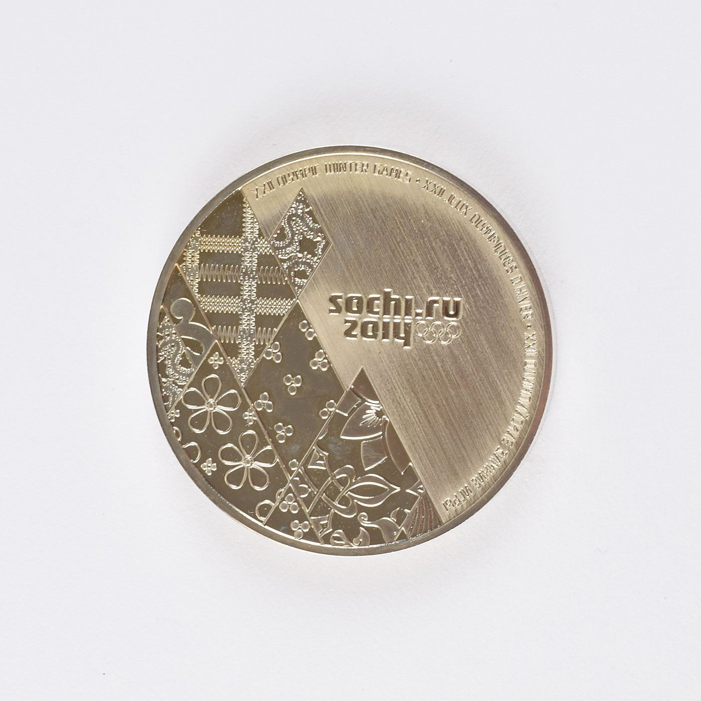 Participation medal issued for the Sochi 2014 Winter Olympics. Polished steel, 50 mm, 81 gm. The front features the Sochi emblem and patchwork quilt design of the various cultures of Russia; the reverse bears the Olympic rings and similar design motif.