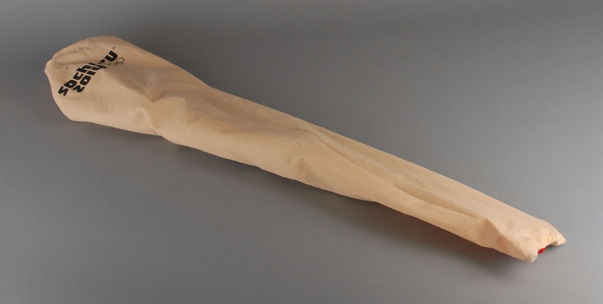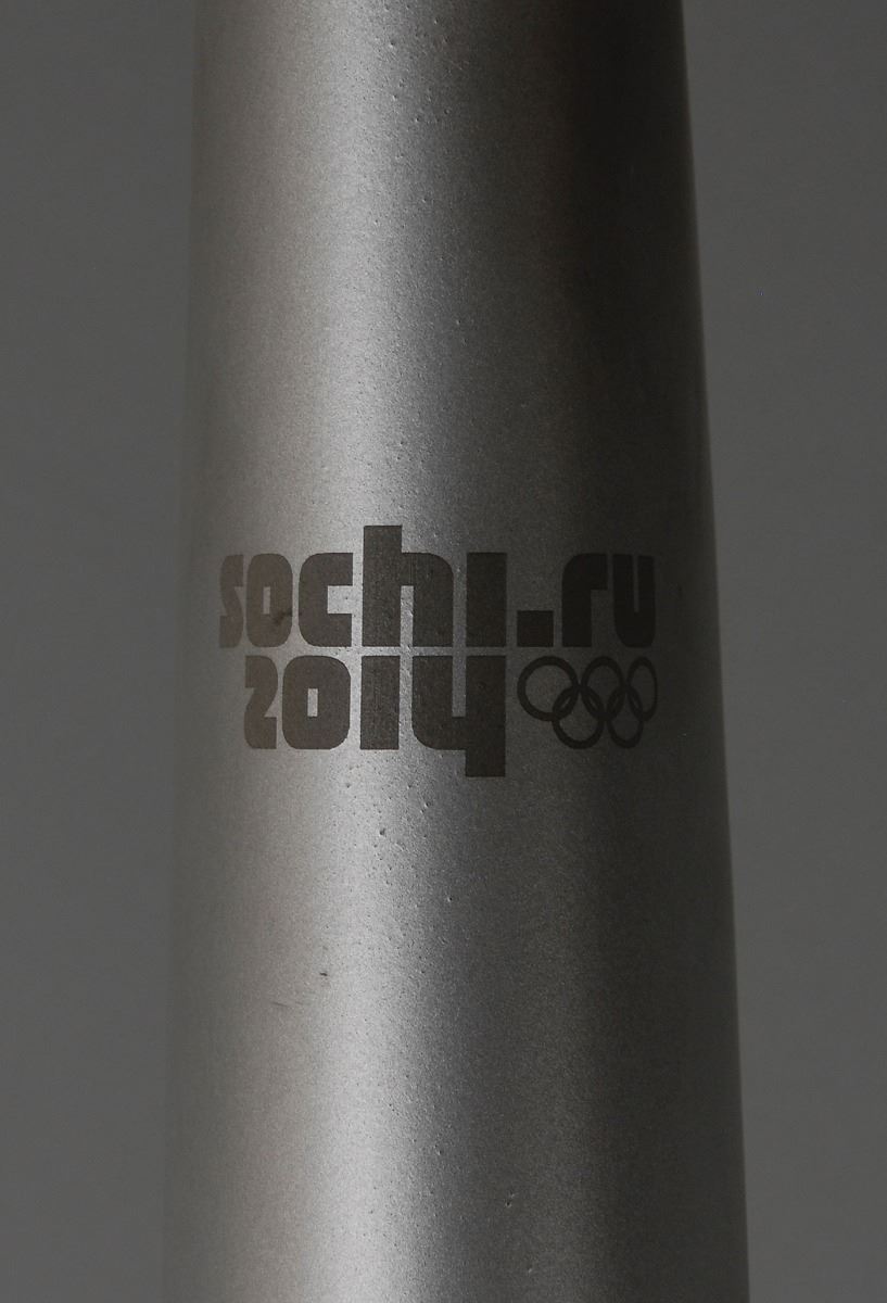 Official 2014 Sochi Winter Olympics torch, constructed of aluminum and various polymers, measuring 37.5? in length and 5.75? at its widest point, developed by a team of designers led by Vladimir Pirozhkov and Andrei Vodyanik. The torch was modeled after the feather of a Firebird or phoenix, which symbolizes good luck or fortune in Russian folklore, and was immortalized in Igor Stravinsky’s eponymous ballet. The torch’s silver represents winter ice, and the red, the traditional color of Russian sport, denotes the fires kindling in the mountains around the resort. The upper portion bears the Sochi Games logo, with two labels near the handle, one reading “029,” and the other faded but presumedly featuring a second Sochi logo. Complete with its original torch relay carrying bag. The Olympic flame was lit in Olympia, Greece, on September 13, 2013, and made its way onto Russian soil on October 7, traveling through all eighty-three regions of the Russian Federation during its five-month and 65,000 km relay. Additionally, other specially designed Sochi torches reached the North Pole, the summit of Mount Elbrus, submerged thirteen meters into Lake Baikal, and another even entered outer space, with cosmonauts Oleg Kotov and Sergei Rayazansky passing the torch outside the International Space Station. Inspired by the feather that bestows good luck in its purest form upon its bearer, this is a wonderful and uniquely designed torch from the most recent Olympic games. Oversized.