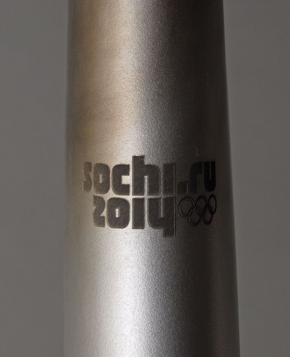 Official 2014 Sochi Winter Olympics torch, constructed of aluminum and various polymers, measuring 37.5? in length and 5.75? at its widest point, developed by a team of designers led by Vladimir Pirozhkov and Andrei Vodyanik. The torch was modeled after the feather of a Firebird or phoenix, which symbolizes good luck or fortune in Russian folklore, and was immortalized in Igor Stravinsky’s eponymous ballet. The torch’s silver represents winter ice, and the red, the traditional color of Russian sport, denotes the fires kindling in the mountains around the resort. The upper portion bears the Sochi Games logo, with two labels near the handle, one reading “082,” and the other a second Sochi logo. Complete with its original torch relay carrying bag. The Olympic flame was lit in Olympia, Greece, on September 13, 2013, and made its way onto Russian soil on October 7, traveling through all eighty-three regions of the Russian Federation during its five-month and 65,000 km relay. Additionally, other specially designed Sochi torches reached the North Pole, the summit of Mount Elbrus, submerged thirteen meters into Lake Baikal, and another even entered outer space, with cosmonauts Oleg Kotov and Sergei Rayazansky passing the torch outside the International Space Station. Inspired by the feather that bestows good luck in its purest form upon its bearer, this is a wonderful and uniquely designed torch from the most recent Olympic games.