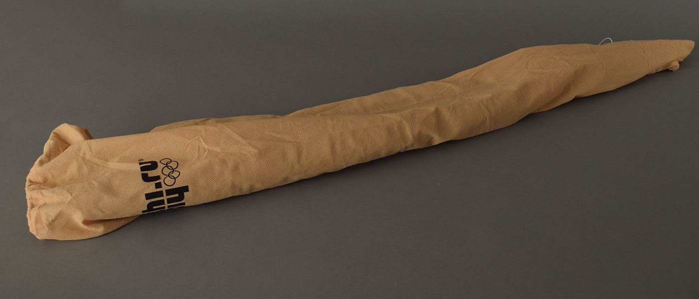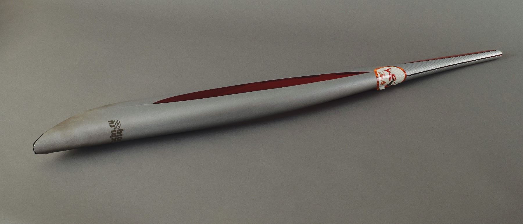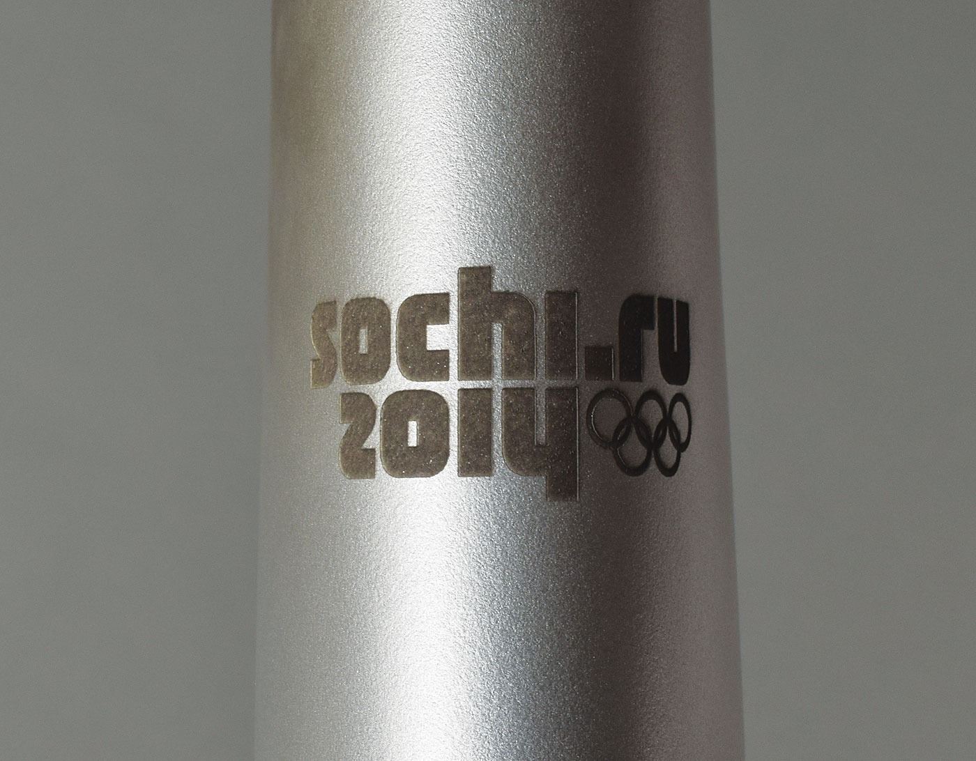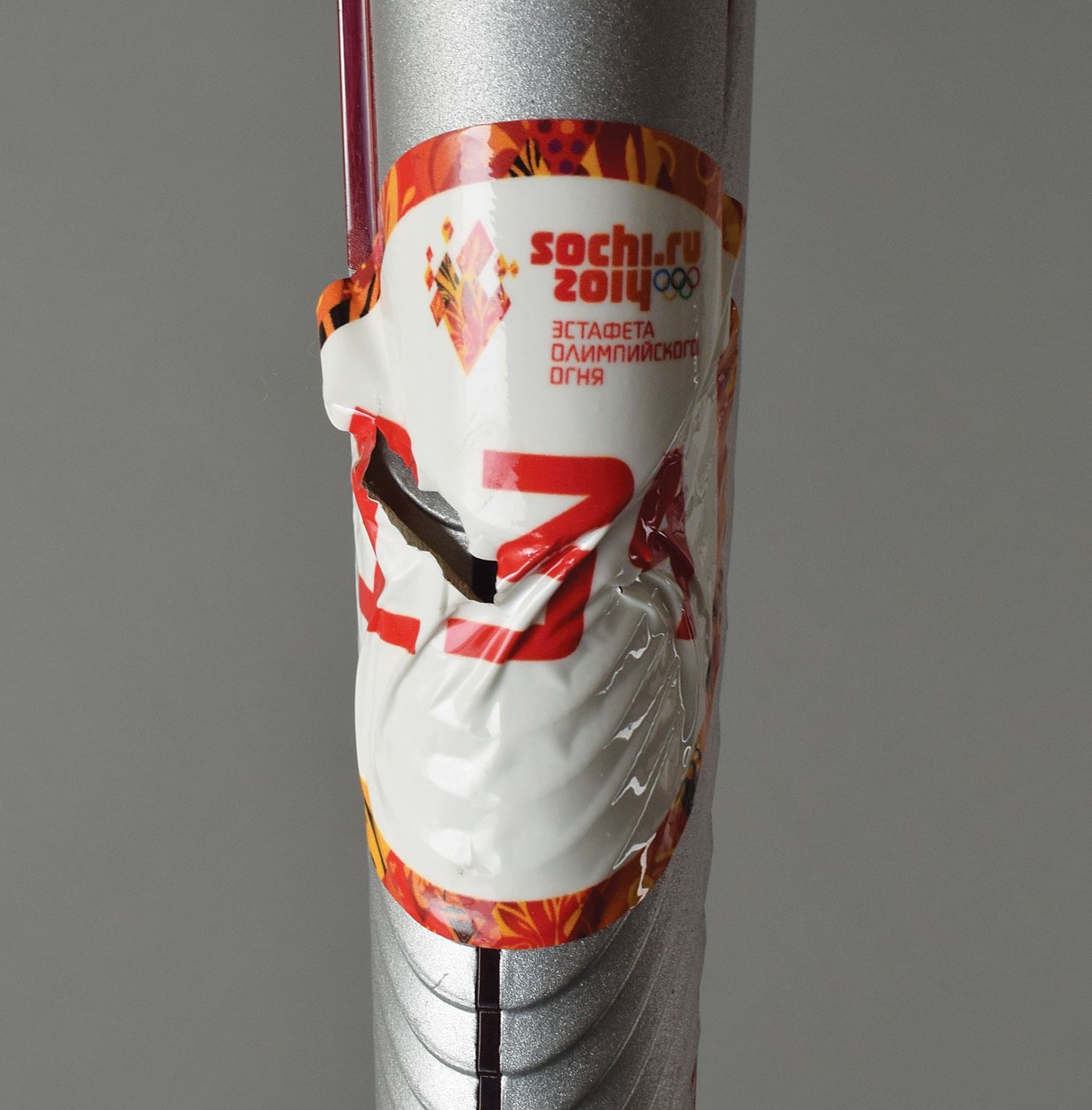Official 2014 Sochi Winter Olympics torch, constructed of aluminum and various polymers, measuring 37.5? in length and 5.75? at its widest point, developed by a team of designers led by Vladimir Pirozhkov and Andrei Vodyanik. The torch was modeled after the feather of a Firebird or phoenix, which symbolizes good luck or fortune in Russian folklore, and was immortalized in Igor Stravinsky's eponymous ballet. The torch's silver color represents winter ice, and the red, the traditional color of Russian sport, denotes the fires kindling in the mountains around the resort. The upper portion bears the Sochi Games logo, with two labels near the handle, both reading "134." One of these labels sealed the metal cover over the body, and the seal has been broken; the cover sits slightly crooked against the body. Complete with its original torch relay carrying bag.