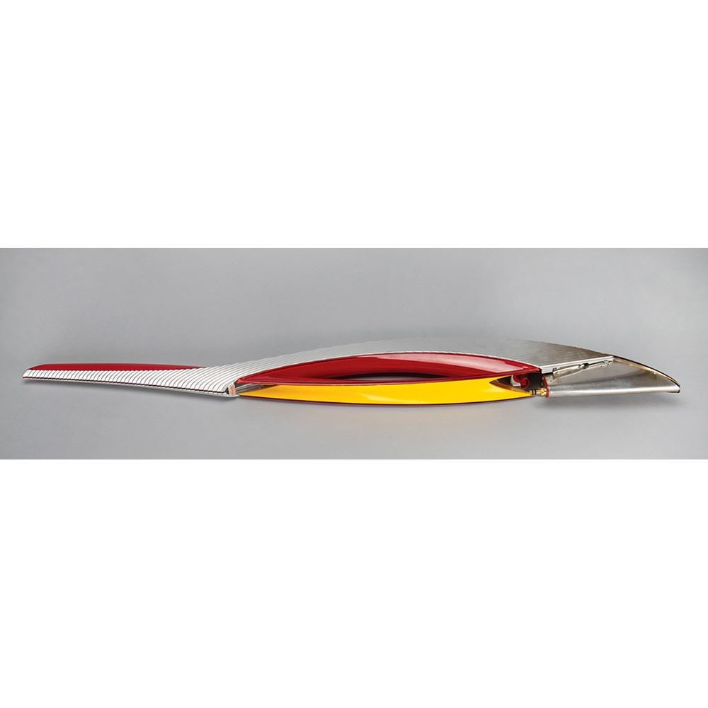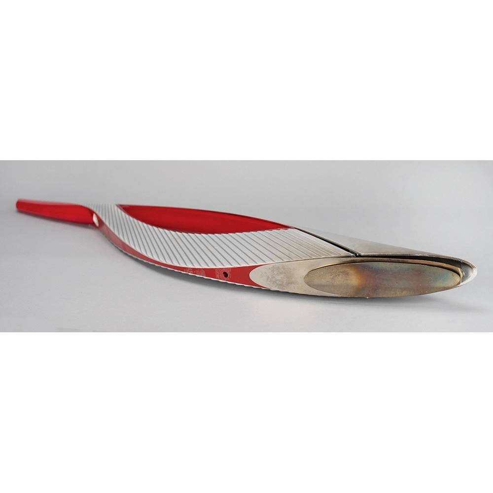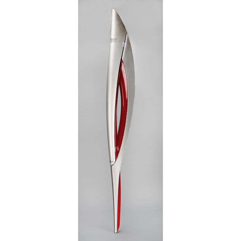 Official 2014 Sochi Winter Olympics torch, constructed of aluminum and various polymers, measuring 37.5" in length and 5.75" at its widest point, developed by a team of designers led by Vladimir Pirozhkov and Andrei Vodyanik. The torch was modeled after the feather of a Firebird or phoenix, which symbolizes good luck or fortune in Russian folklore, and was immortalized in Igor Stravinsky's eponymous ballet. The torch's silver color represents winter ice, and the red, the traditional color of Russian sport, denotes the fires kindling in the mountains around the resort. The upper portion bears the Sochi Games logo, with one label near the handle reading "111." The cover, which features some scuffing, was previously detached to remove the torch's propane; as a result, the lower seal was cut, the interior adhesive broken, and the cover no longer connects tightly to body. Complete with its original torch relay carrying bag. Accompanied by a custom-made display stand.