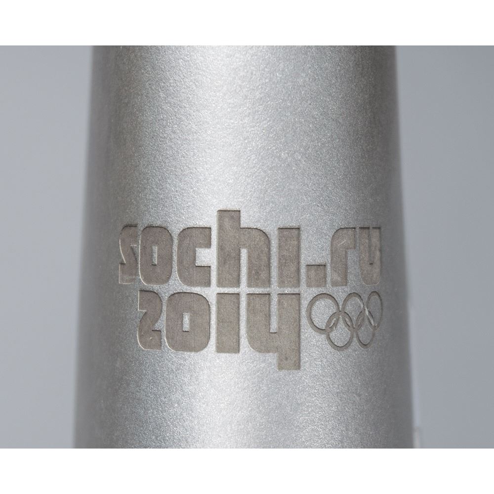 The Olympic flame was lit in Olympia, Greece, on September 13, 2013, and made its way onto Russian soil on October 7, traveling through all eighty-three regions of the Russian Federation during its five-month and 65,000 km relay. Additionally, other specially designed Sochi torches reached the North Pole, the summit of Mount Elbrus, submerged thirteen meters into Lake Baikal, and another even entered outer space, with cosmonauts Oleg Kotov and Sergei Rayazansky passing the torch outside the International Space Station. Inspired by the feather that bestows good luck in its purest form upon its bearer, this is a wonderful and uniquely designed torch.