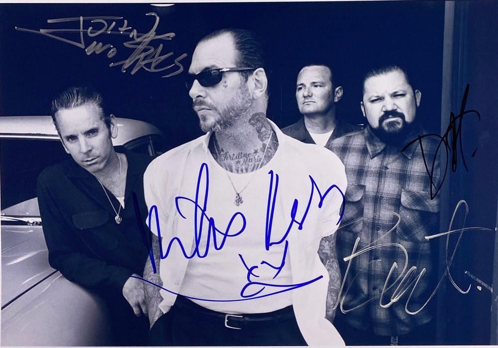 Social Distortion band facsimile facsimile signed photo autographed by Mike Ness, Jonny Wickersham, Brent Harding and David Hidalgo Jr. 8x10 inches. This item is a reprint of an original autograph