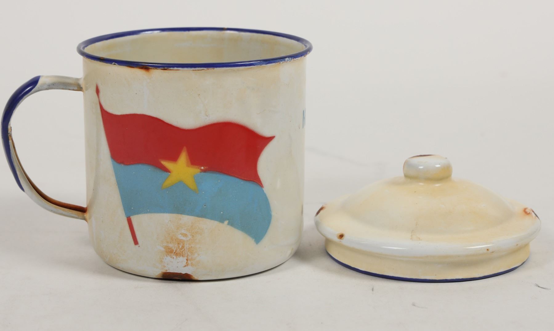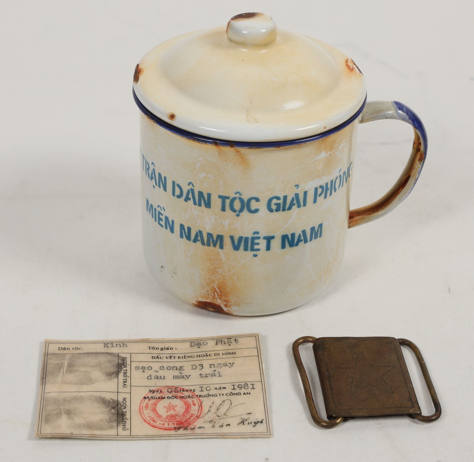 1981Repiblic of Viet Name ID card , issued by Chief of Police in plastic. Belt buckle w/ 5 point star an a metal cup w/ lid inscribed " National Liberation Front of South Viet Nam".