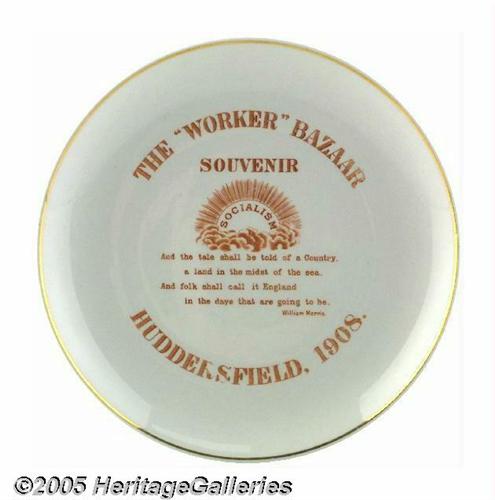 <B>Socialist "Worker" 1908 Bazaar 9" Plate</B></I> This red on white 1908 plate with gold band around the rim commemorates an early Socialist "Worker" bazaar in Huddersfield and carries the symbol of SOCIALISM rising like the sun. It carries the quote, "And the tale shall be told of a Country, a land in the midst of the sea, And folk shall call it England in the days that are going to be." William Morris. There are few Socialist 3-D items. This plate has slight wear on the "R" and ""S of "HUDDERSFIELD," but overall a fine item. Lot:261