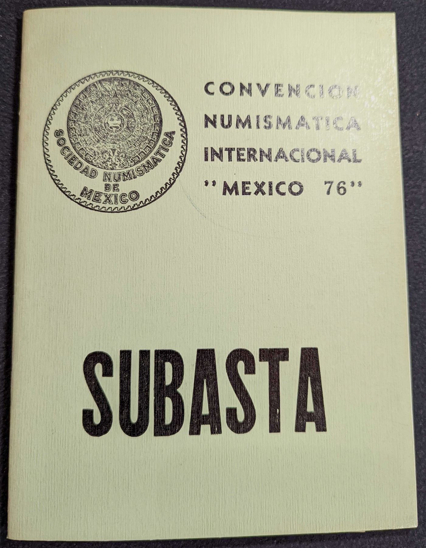 Sociedad Numismatica de Mexico. CONVENCION NUMISMATICA MEXICO 76. SUBASTA. March 25-26, 1976. 1-801 lots. Sale No. 23. This auction sale catalog includes numismatic material from Mexico. This sale comprises Colonials, Mexican States, Iterbide, Maximilian, Morelos, Revolution, Gold, Gold Medals, Medals, Tokens, Non-Mexico, Paper Money, Books. Mexico City. original printed card covers. Fine. 8vo. 28, (4) pages. PRL. Very scarce and hardly ever seen sale. Lot weight: 0 lbs 3oz. Subject(s): Mexican Coinage, Paper Money, and Medals.