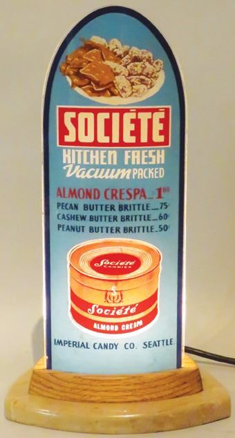 Societe Almond Cream Light Up Sign. Imperial Candy Co. Seattle. Crack on marble base otherwise good working condition. 8 X 14 X 8 inches.