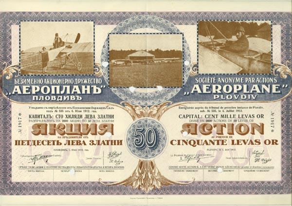 1912, France. Stock certificate. Blue/Brown. A spectacular certificate printed in both Russian and French. Three photographic vignettes across the top. At top left an early aircraft, at top center an airfield and at top right a closeup of the pilot in his airplane. One circular stamp at extreme left center below an adhesive revenue stamp. Punch cancelled, two which lightly affect the border of the center vignette. This is one of the finest examples of aviation related certificates we have seen. Visually superb.