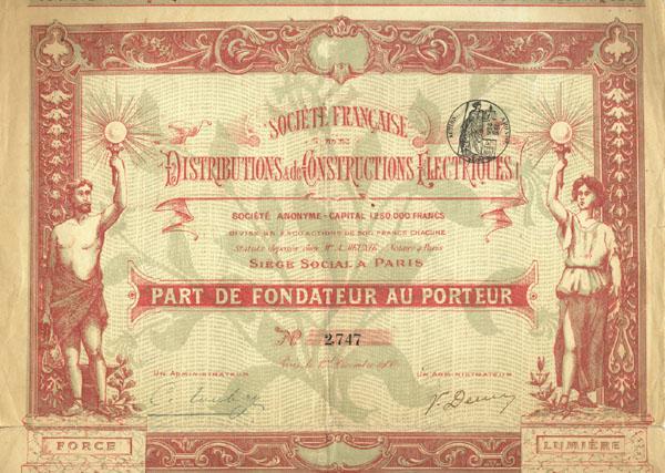 1900, Paris. Stock certificate. Maroon on light green/tan background. Female and male allegorical figures holding brightly lite torches at left and right margin. Litho. Coupons below. Uncancelled and Very Fine