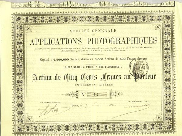 1883, Paris. Stock certificate for 500 francs. Black. Litho. An early French photography related stock. Coupons below. Uncancelled and Extremely Fine.