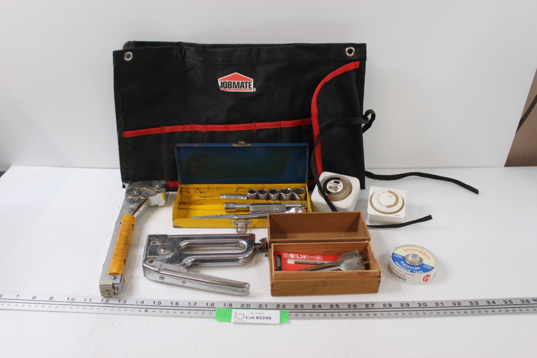 Socket Set in Case, Jobmate Organizer, (2) Staple Guns, Drill Bits - Assorted, (2) Timers, as is, Mi