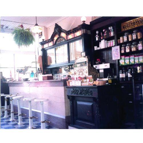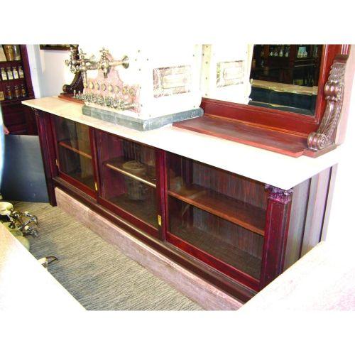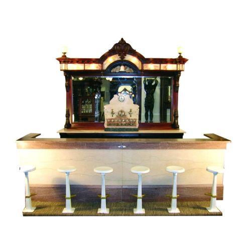 Soda Fountain Front Bar and Back Bar from the Bastian Blessing Company. Mahogany, marble and onyx, beveled mirror with marble bases. Comes with six matching cast iron and porcelain stools. Perfect for the home or business. Excellent condition. Front measures 107 X 118 1/2 X 26 inches and back 144 X 42 X 37 inches.