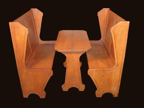 Soda fountain booth out of old drug store. Two high back benches and a table appears to be pine.