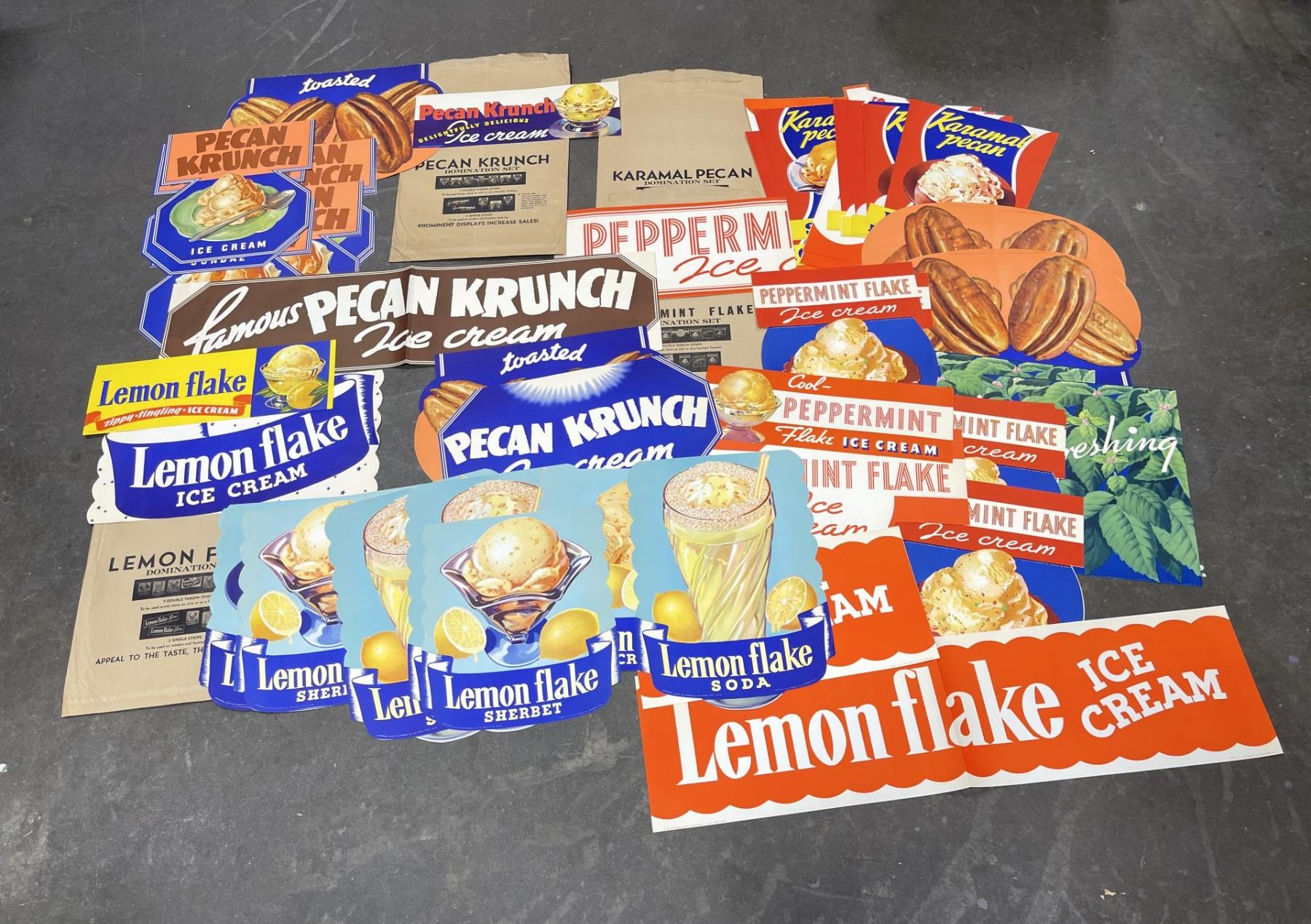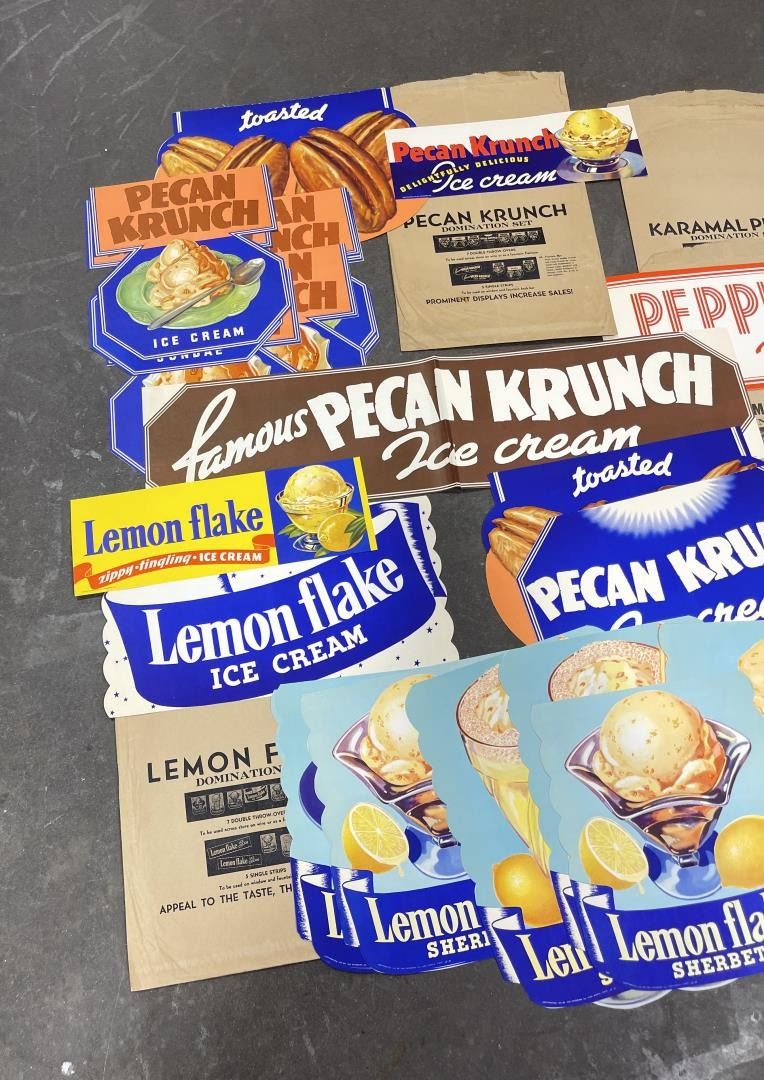Nice grouping of paper store display signs. Mint Flake, Karamal Pecan, Pecan Krunch, Lemon Flake.