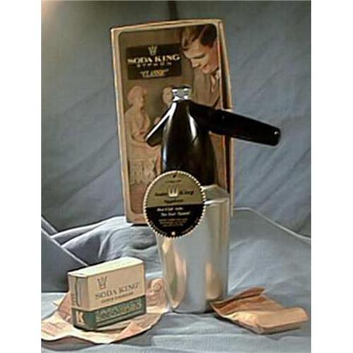 This Soda King Syphon "Classic" comes in it's original box. Acording to the box you can "MAKE TANGY CLUB SODA IN AN INSTANT". The hang tag reads "1 FULL QT. Soda King Syphon best Club Soda You Ever Tasted! Bubblier bubbles that make drinks livelier and tastier, yours always on tap. KIDDE MANUFACTURING CO BLOOMFIELD, N.J. MF828B" The color is ice silver 7631070. Along with the seltzer pump there are 2 cartridges, one NO. 607552-T2 special screw driver and an unopened box of SALT and SUGAR FREE SODA KING SUPER-CHARGERS. Retail price was $16.95 and the chargers were $1 a package. It has never been used. The inspection slip is dated DEC 7-1966. The Eiben & Irr Co. sales slip is also included.