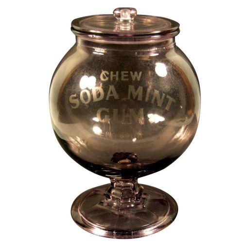 Rare Soda Mint Gum etched glass store jar, sun colored glass. Original lid, small chip on the lip of the jar otherwise excellent condition. 14 inches tall X 10 inch diameter.